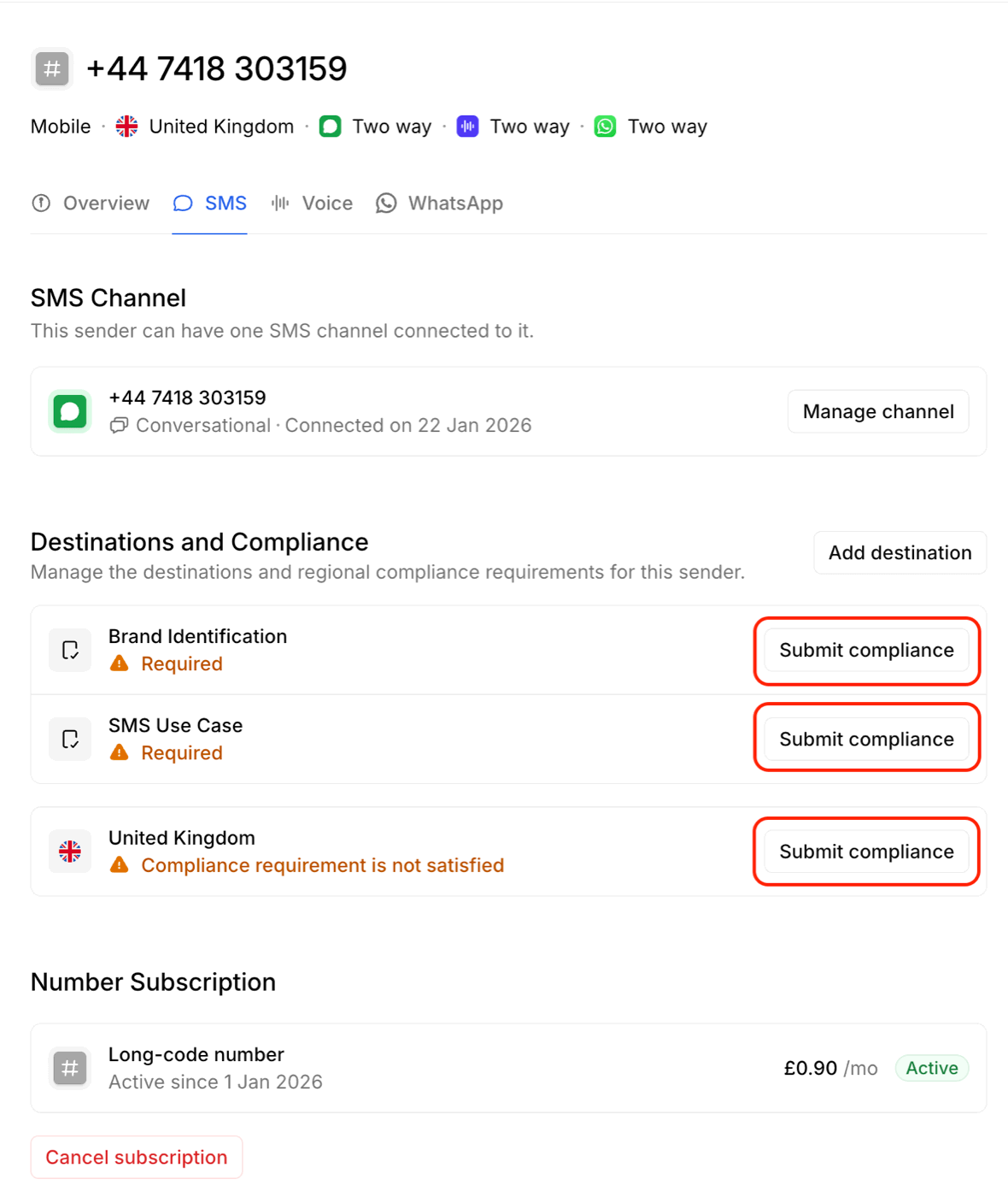 Once submitted, the compliance verification process can take several weeks to complete, during this time you can receive SMS message but you will be unable to send SMS messages.