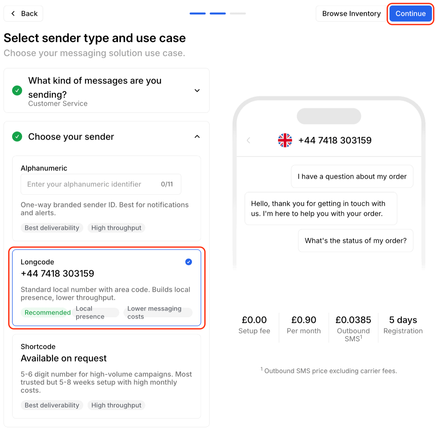 Select 'Longcode' as the sender and then click the blue 'Continue' button in the top right..