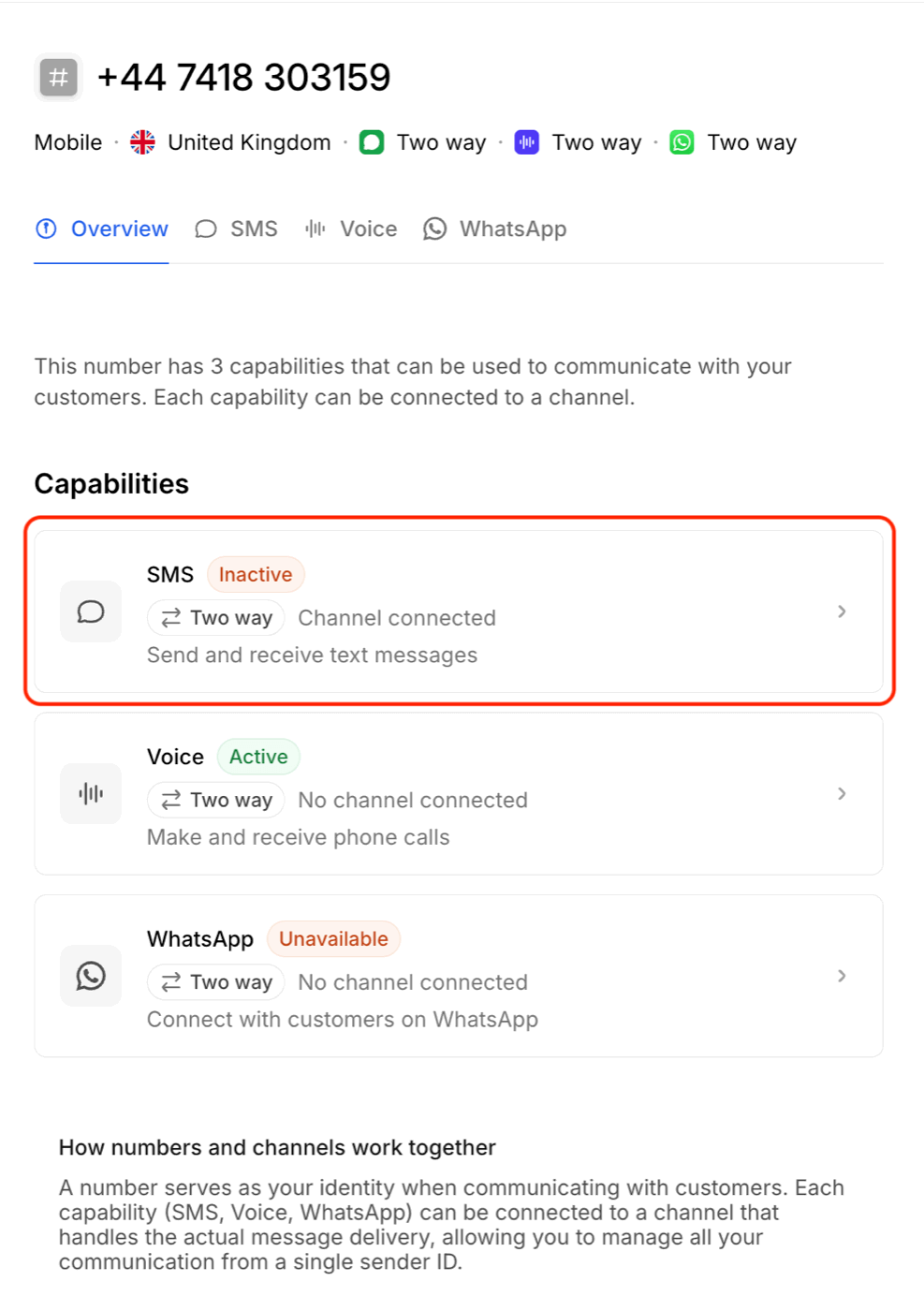 Select your number that you have just bought. You will then be presented with a screen that contains this section. You will need to click 'SMS' and then for each item in the 'Destinations and Compliance' section, you will need to complete the compliance.