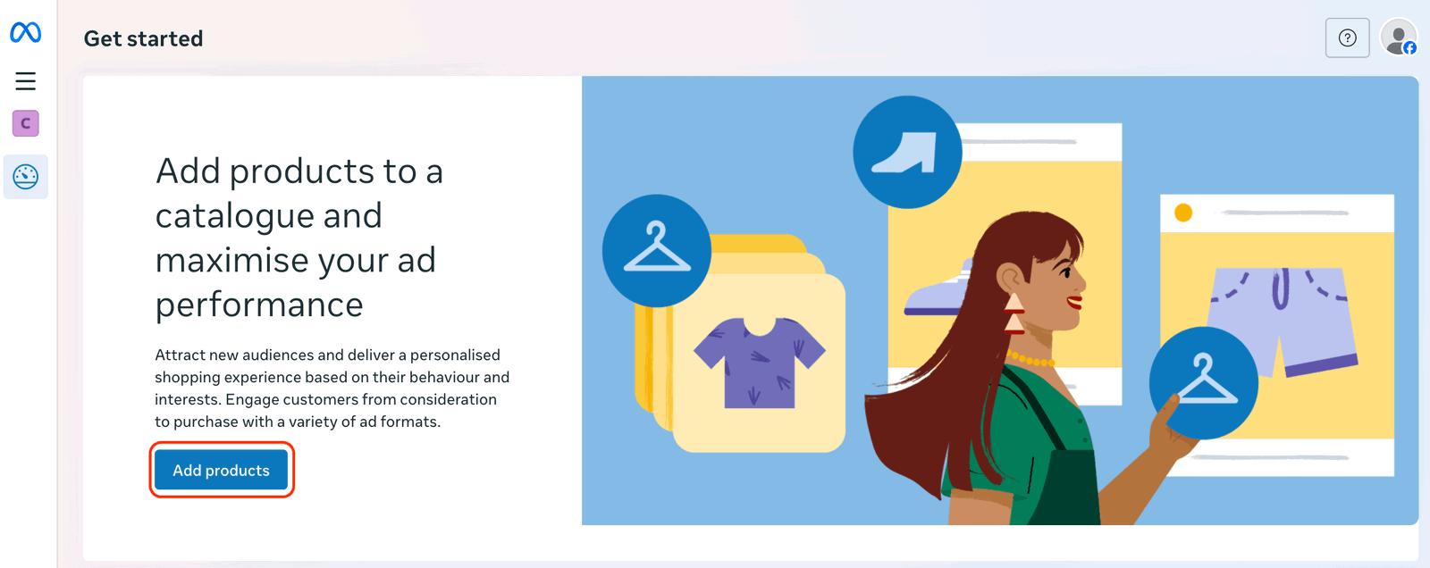 If this will be your first catalogue, you'll see a 'Get Started' page. Click 'Add products' to create a catalogue.