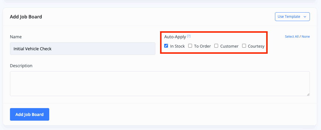 The 'Auto-Apply' option allows you to control whether the Job Board will be automatically added to new stock of the vehicle type specified.