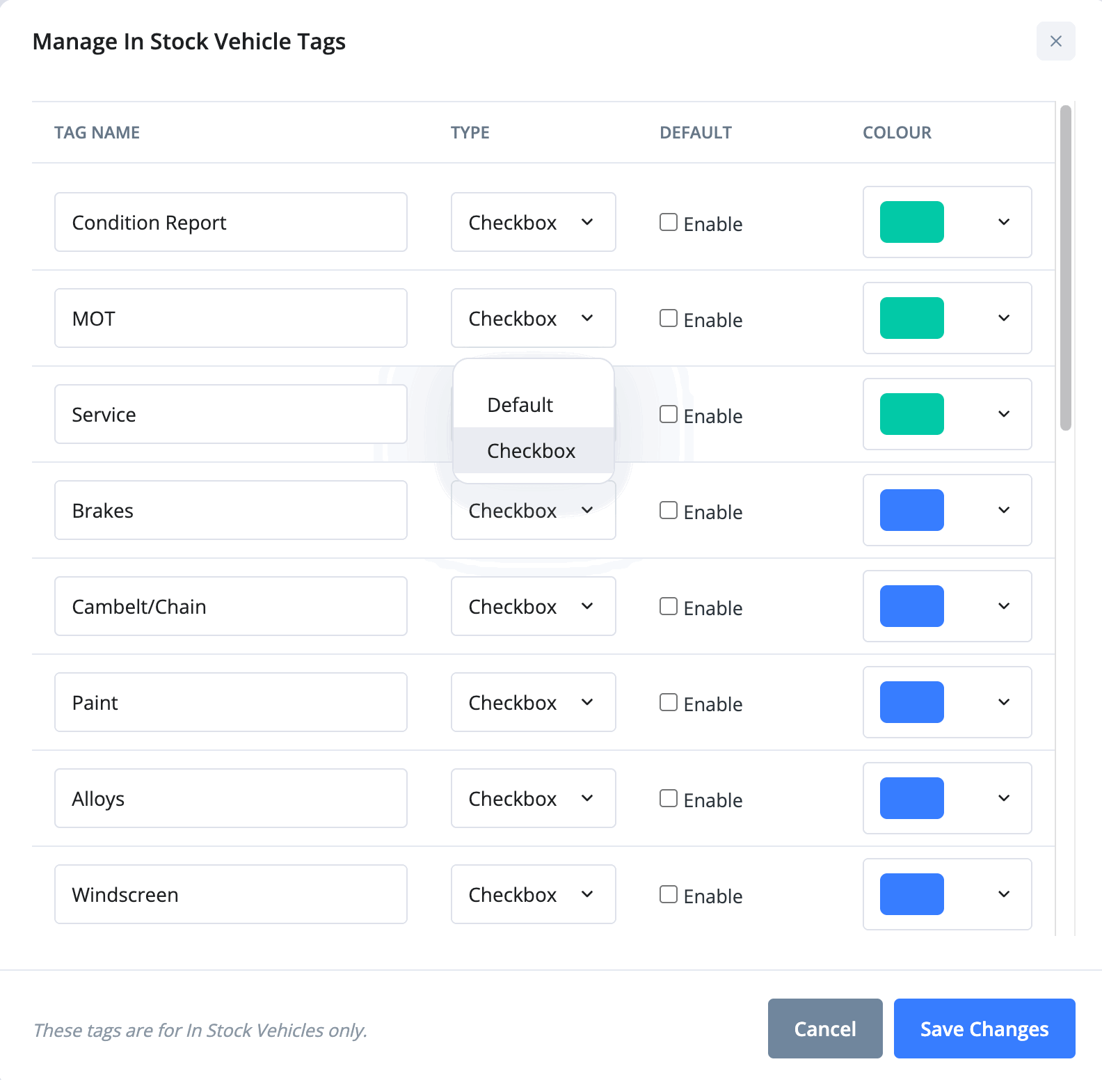 The 'Type' option for each tag lets you choose if you want the tag to be a checkbox or just the default badge look. The checkbox option allows you to mark tags as complete, for example you check the 'Service' tag off once you have completed some job.