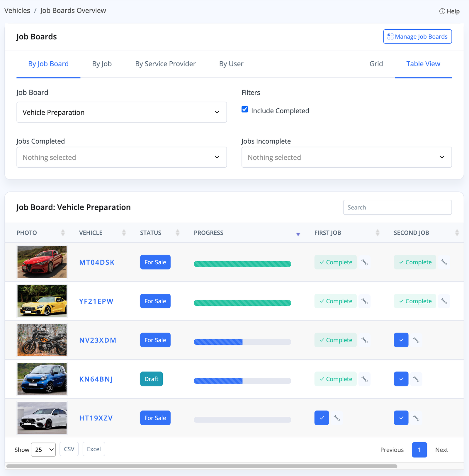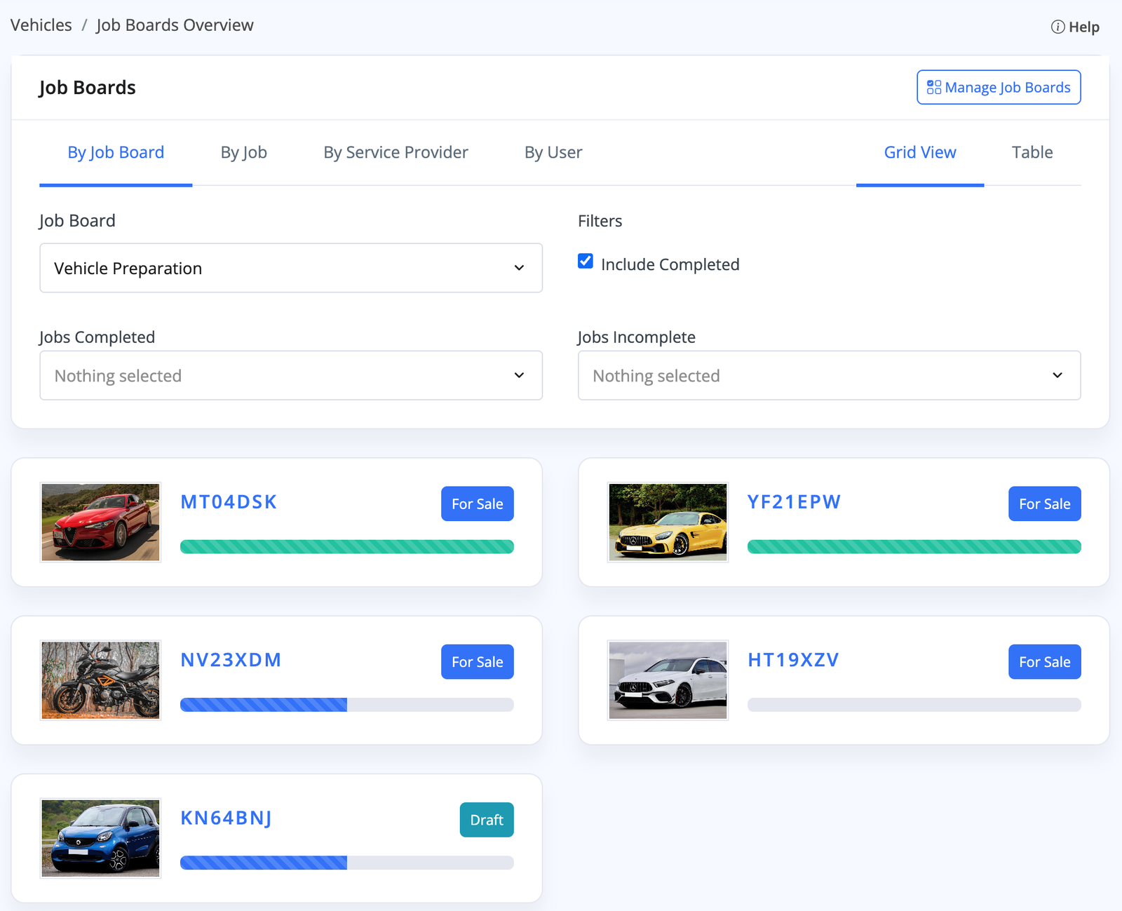 The Vehicles -> Job Boards Overview section allows you to view and manage your vehicle jobs in bulk, with different views to organise by Job Board, Task, Service Provider and User. With an option to choose between a 'Grid' view and a 'Table' view of all your active job boards for specific vehicles - allowing two alternate ways of tracking, organising, and managing your jobs.