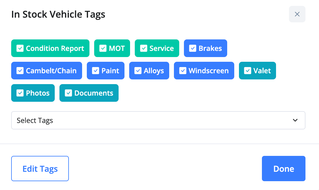 This will display a pop-up window where you can view all the current tags applied to the vehicle.