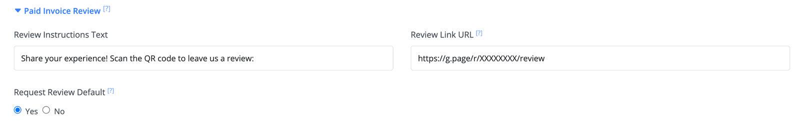If you want this option to be enabled by default, meaning all invoices you create will contain this URL/QR code for customers to leave reviews, go back to the 'Paid Invoice Review' subsection and enable the 'Request Review Default' option.
